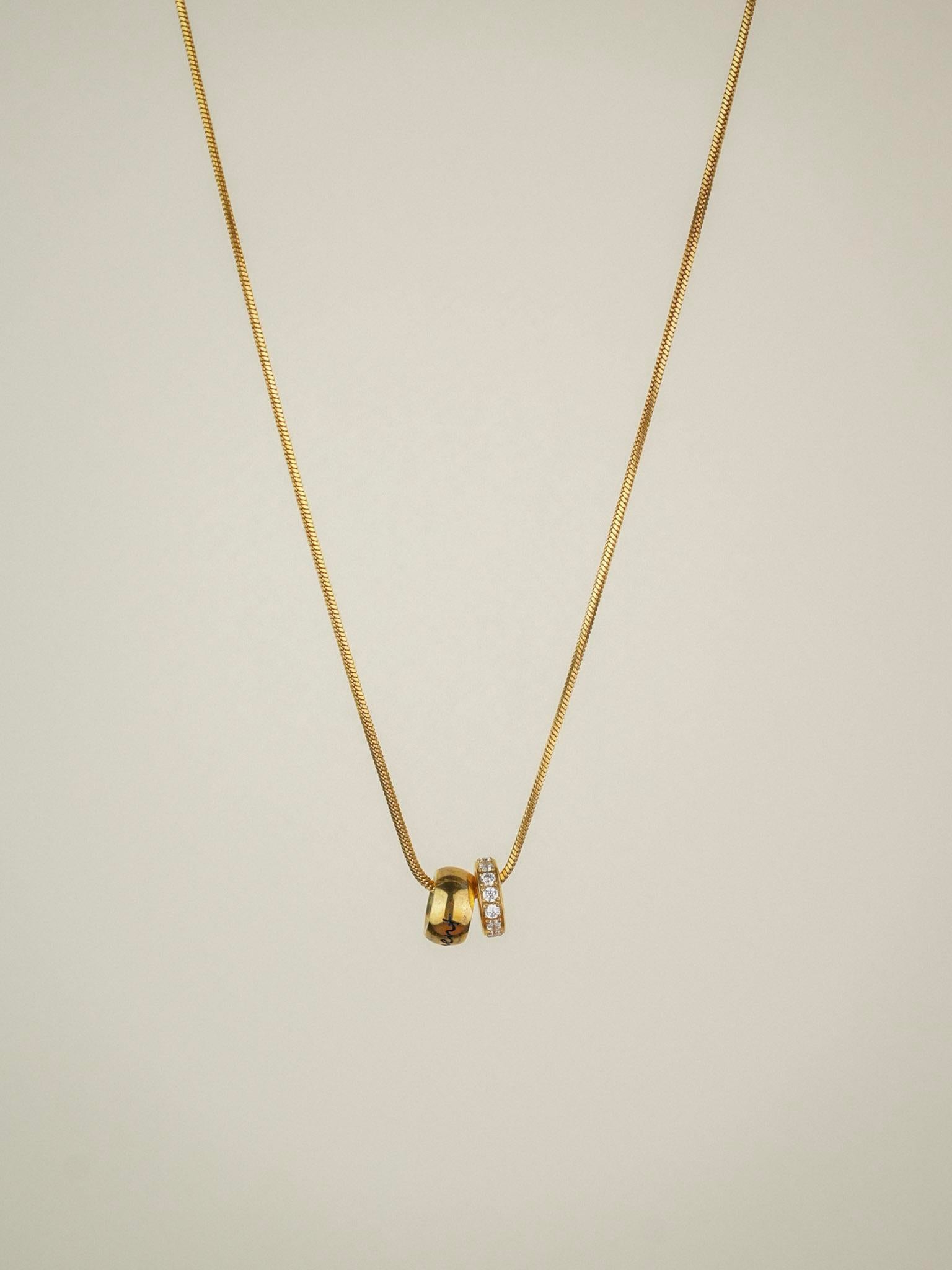 The Heureuse Rings Pendant is a tribute to joy and connection — two interlocking rings, one engraved with the word “Heureuse” (happy), the other encrusted with dazzling zircon crystals. A soft reminder that happiness often blooms through the bonds we choose and the light we carry.