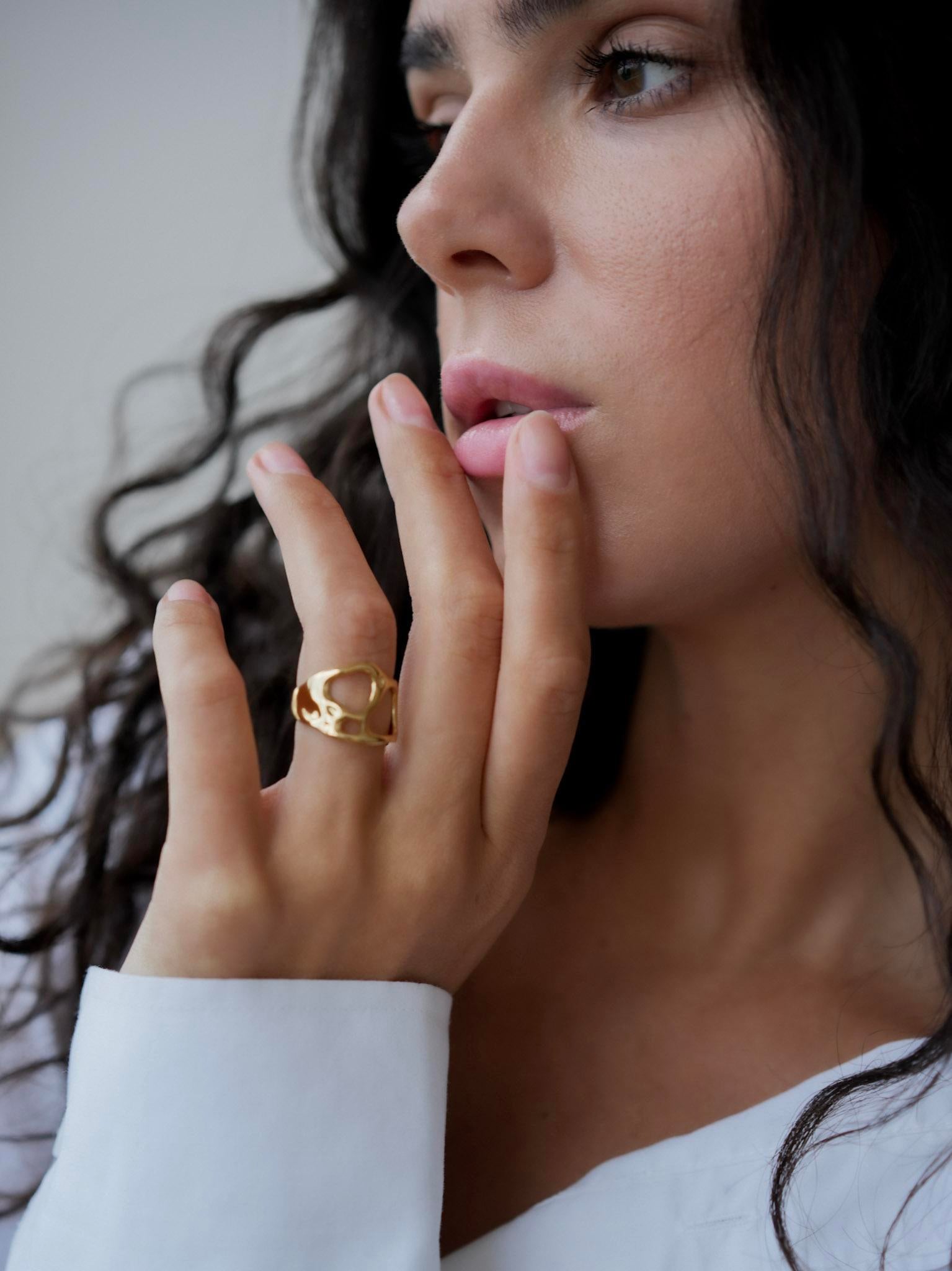 The Molten Hollow Ring fuses organic asymmetry with bold geometric cutouts, creating an eye-catching silhouette that feels like wearable art. Inspired by Liquid Metal and sculptural form, it adds an effortless edge to any outfit — striking yet fluid, minimalist yet expressive.